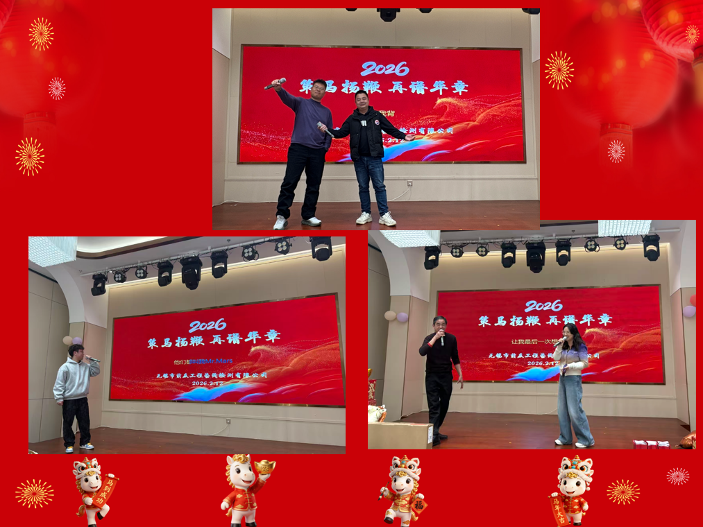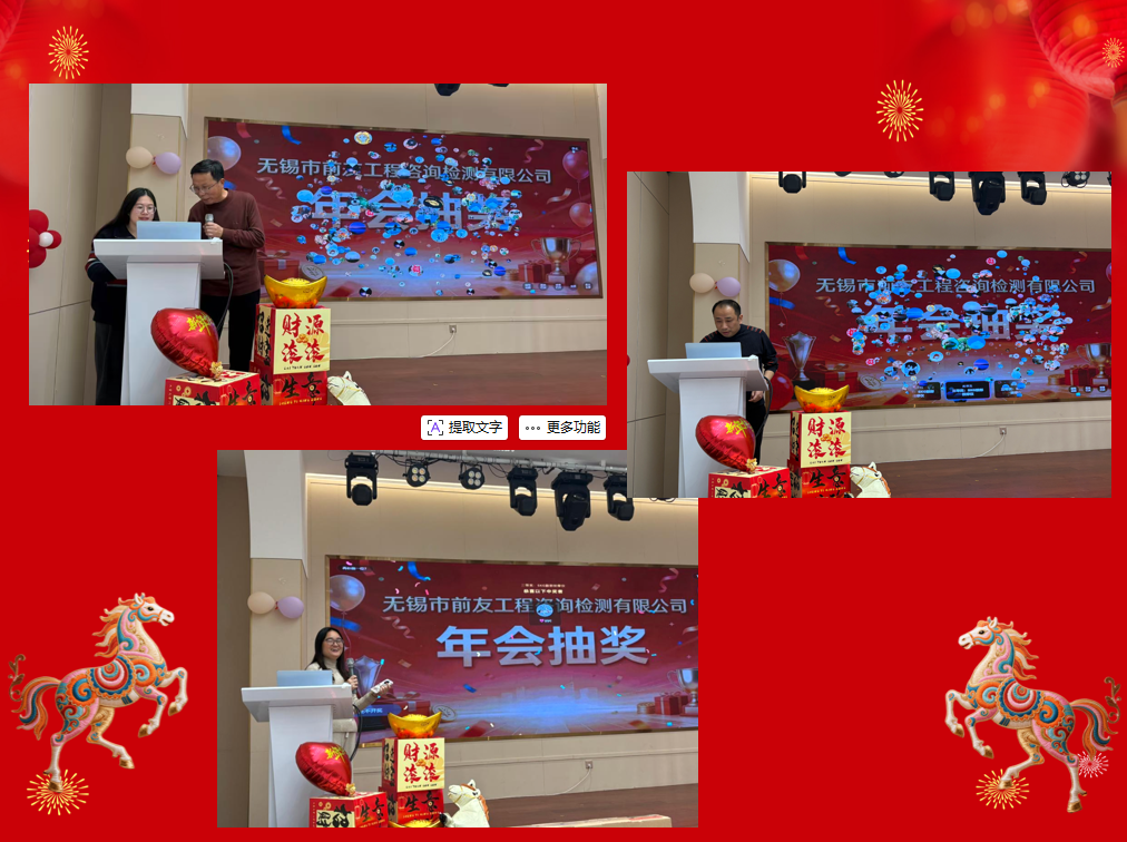 金蛇銜福辭舊歲,駿馬奔騰賀新春。2月12日,馬年新春佳節(jié)即將來臨之際,無錫市前友工程咨詢檢測有限公司全體員工伴隨著歡快的樂曲歡聚一堂,共憶過往耕耘,共話未來愿景,共度一段溫馨而熱烈的美好時(shí)光。 年會(huì)上,公司總經(jīng)理鄒佳樺發(fā)表了新春致辭,向全體員工送上新春的美好祝福與誠摯感謝。2025年,憑借全體員工的持續(xù)努力,公司榮獲了江蘇省專精特新中小企業(yè)、無錫市模架協(xié)會(huì)優(yōu)秀企業(yè)、江蘇省建設(shè)工程質(zhì)量檢測技術(shù)創(chuàng)新論文一等獎(jiǎng)以及無錫碩放機(jī)場改擴(kuò)建工程2025年度勞動(dòng)競賽先進(jìn)單位等榮譽(yù),充分展現(xiàn)了公司的市場競爭力與企業(yè)形象。 致辭結(jié)束后,年會(huì)進(jìn)入最令人期待的抽獎(jiǎng)環(huán)節(jié),現(xiàn)場氛圍瞬間被推向高潮。伴隨一次次開獎(jiǎng),現(xiàn)場掌聲與歡呼聲此起彼伏,每份獎(jiǎng)品都飽含公司對(duì)員工的關(guān)懷之情,也寄托著對(duì)新一年的美好祝愿。員工們陸續(xù)登臺(tái)獻(xiàn)唱,以歌聲和笑聲傳達(dá)馬年的快樂與祝福,彰顯前友員工積極向上的精神面貌。現(xiàn)場氣氛異常熱烈,鄒總臨時(shí)決定增設(shè)一個(gè)一等獎(jiǎng)的抽獎(jiǎng)名額,這一突如其來的好消息瞬間引爆全場。公司多年積淀的企業(yè)文化,已將前友員工緊密相連,匯聚成一個(gè)生機(jī)勃勃、溫情滿滿的幸福大家庭,杯盞交錯(cuò)間,暖流涌動(dòng),歡樂的氛圍持續(xù)整場晚會(huì)。 伴著歡聲笑語慢慢消散,2025年也完美畫上句點(diǎn)。舊歲已展千重錦,新年再進(jìn)百尺竿。2026馬年新征程已然開啟,前友人將懷揣更加熾熱的激情,秉持更加堅(jiān)定的信念,策馬揚(yáng)鞭、奮勇爭先,昂首闊步踏上新的奮斗征程,共同書寫公司高質(zhì)量發(fā)展的新篇章!